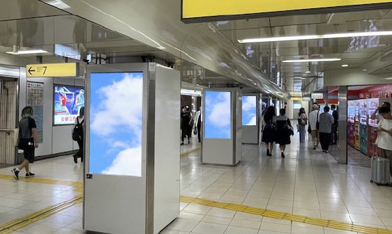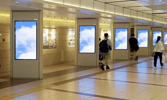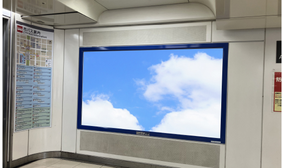 - 新幹線改札口前と、JR線と地下鉄との乗り換え動線上にある商業施設通路に設置された連続多面の縦型サイネージです。通行者に対し、繰り返しアプローチが可能です。