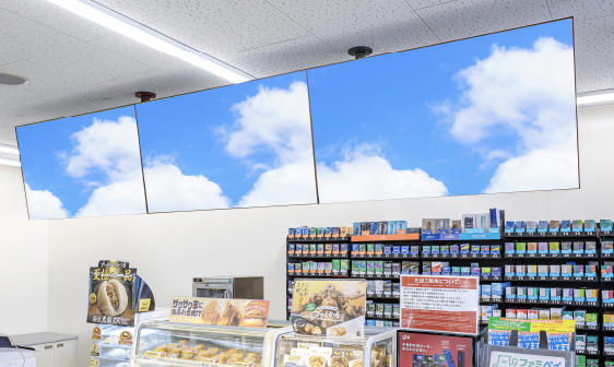 - 3連大型ディスプレイで見せるクリエイティブ、関心を引き、臨場感を高める音声配信。必ず立ち寄るレジ周りで目につき、記憶に残ります。