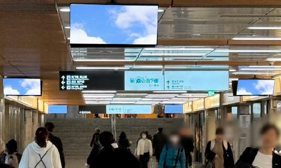 - 名鉄栄町駅・地下鉄栄駅直結の「森の地下街」内に設置されたサイネージで、動画による力強い表現力と優れた視認性、外付けスピーカーによる鮮明な音の効果と改札前を中心に設置した24面のパネルが連続することにより、高い広告効果を生み出します。